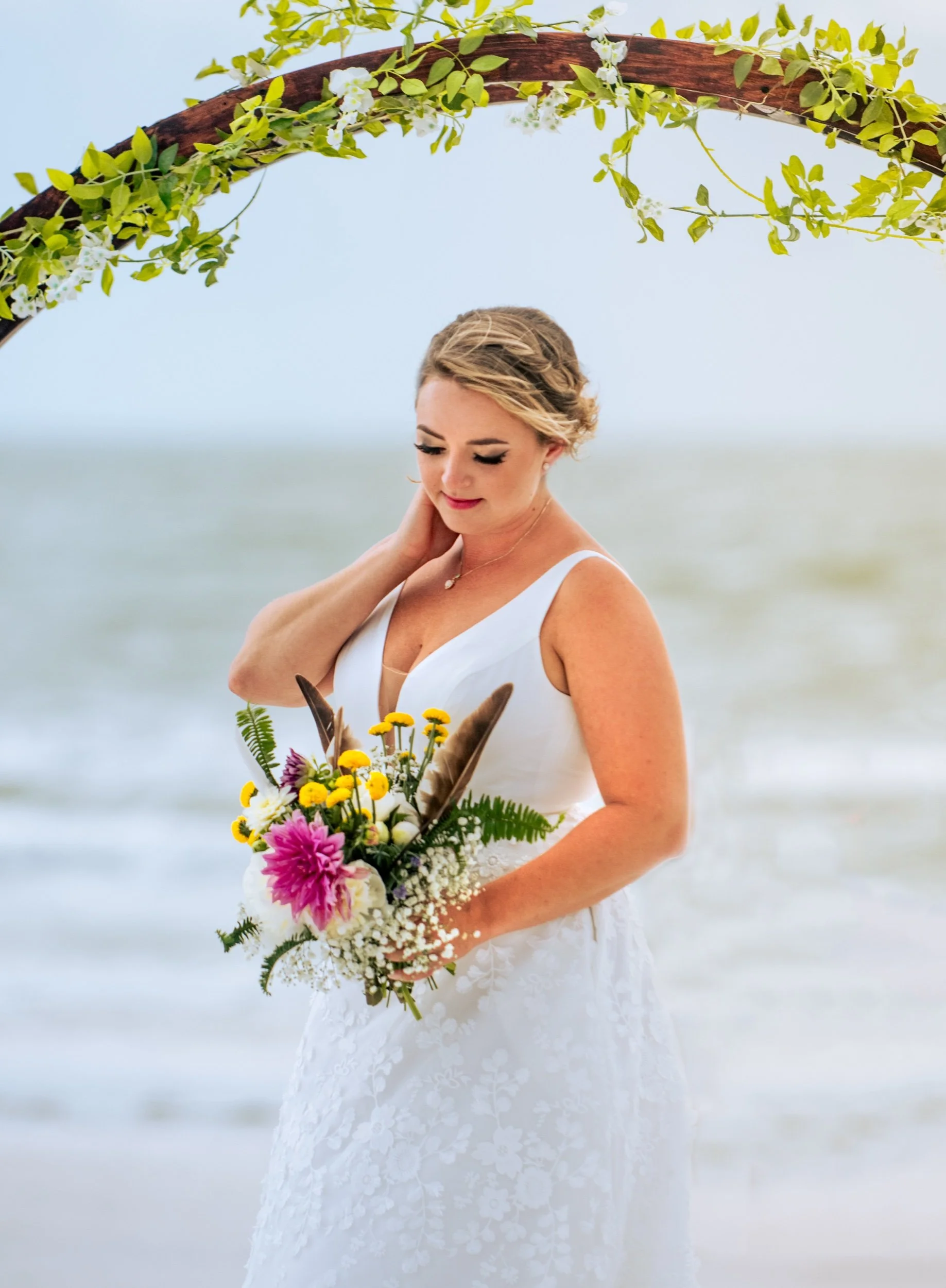 Dreamy luxurious elopement session with custom floral frame with roses. Starkey nature park elopement photograph with women in blue dress and Florida blue skies professional photography Tampa Bay Area